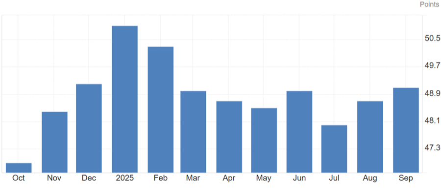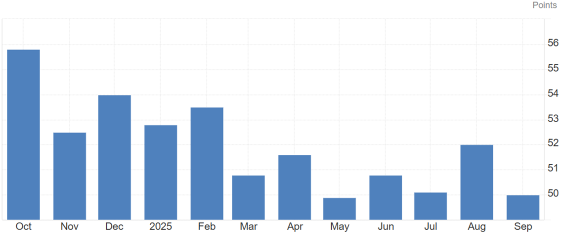 Investors also saw some economic data in the form of the ISM Manufacturing and Services Indices. The Manufacturing activity rose to 49.1 in September, slightly above expectations of 49 but remains in a state of contraction (below 50) as tariff uncertainty continues to pressure new order activity – particularly within machinery, metals, and semiconductors. Business activity within the services sector dropped to 50 in September from 52 in August, and below expectations of 51.7. The decline added an element of stagflation with the largest sector of the economy experiencing slowing growth, higher inflation, and moderating employment.