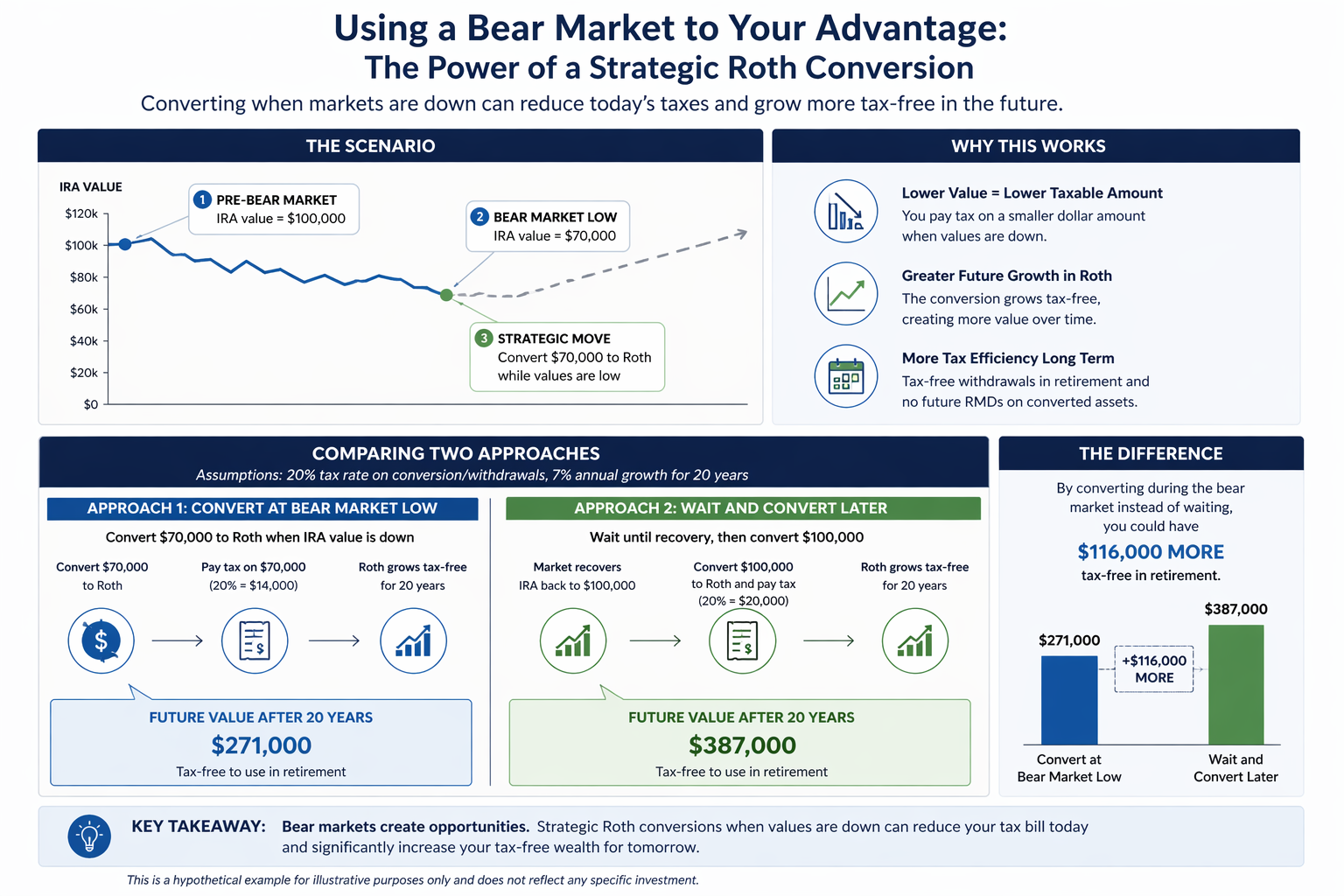 This strategy highlights a broader principle: volatility can be used constructively when viewed through a long-term lens. By proactively converting during periods of market weakness, investors may not only reduce current taxes but also increase the amount of assets positioned for tax-free growth over time.